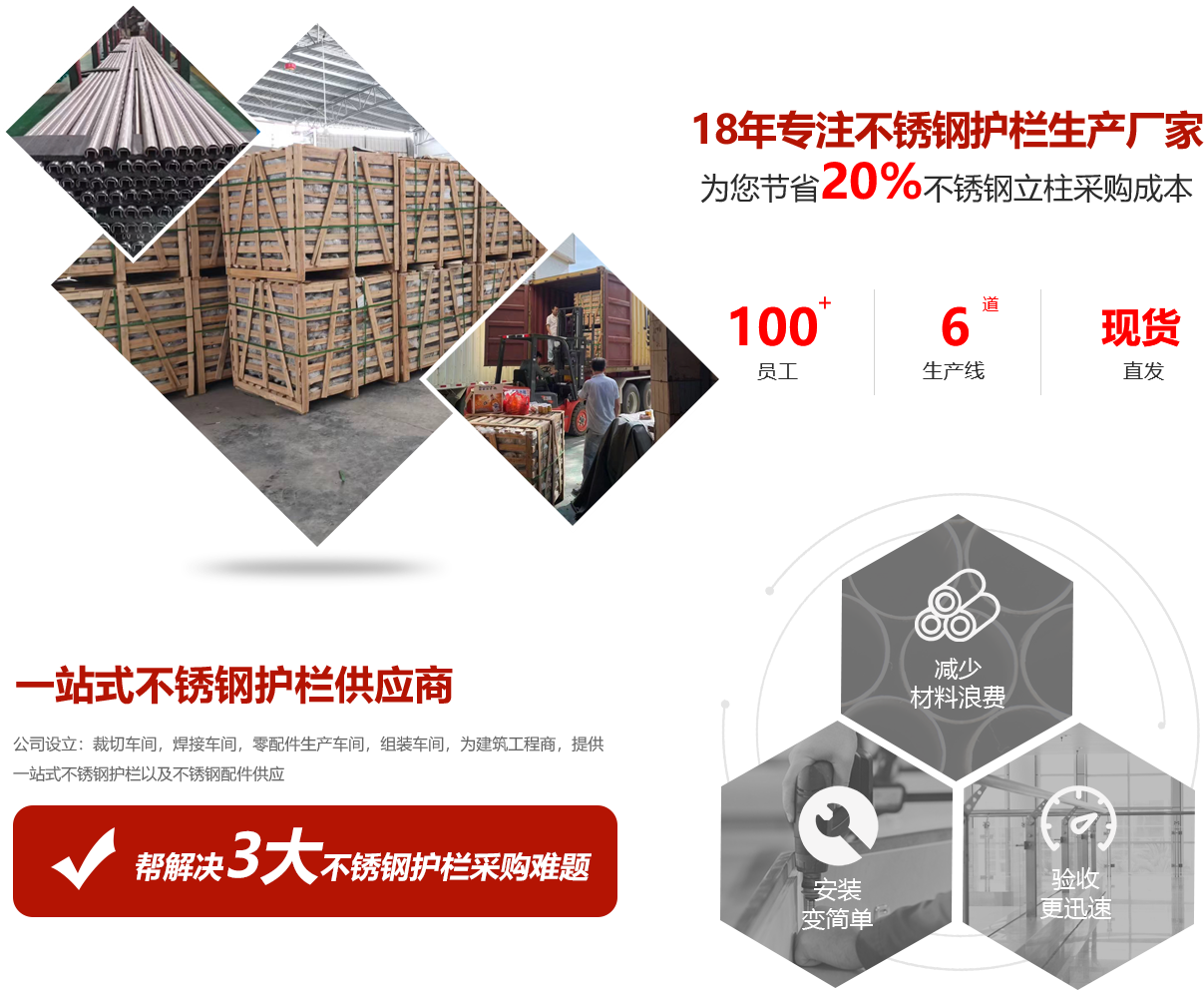 佛山市國正五金制品有限公司,成立于2005年,位于交通便利,供應鏈完整,制造業發達的廣東省佛山市樂從鎮。我們是一家集研發、生產、銷售、服務于一體的不銹鋼五金配件、不銹鋼立柱,不銹鋼護欄和不銹鋼扶手配件的專業制造商。擁有各種電商平臺買家,支持加工定制,我們擁有自主品牌,深受客戶青睞,公司占地4000平米,年產量不銹鋼五金配件、不銹鋼立柱,不銹鋼護欄和不銹鋼扶手配件等,高達20萬套,我們擁有良好的交付能力,現貨可以做到48小時發貨,我們擁有自己專業的工程項目部門,為國內外建筑公司提供有效的設計安裝解決方案。無論是從我們的產品目錄直接選擇現有的產品,還是為您的工程尋求支持幫助,您都可以與我們的客服人員討論您的采購需求。我們將竭誠為您提供專業、優質的商務服務。進入詳情>>